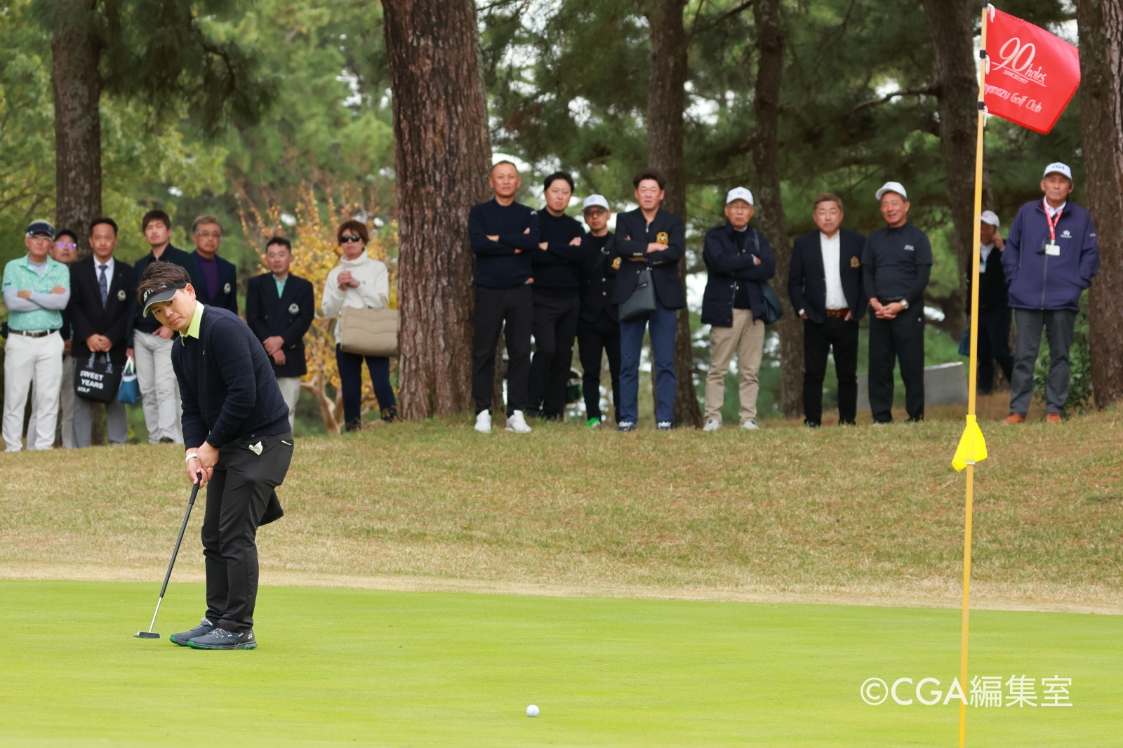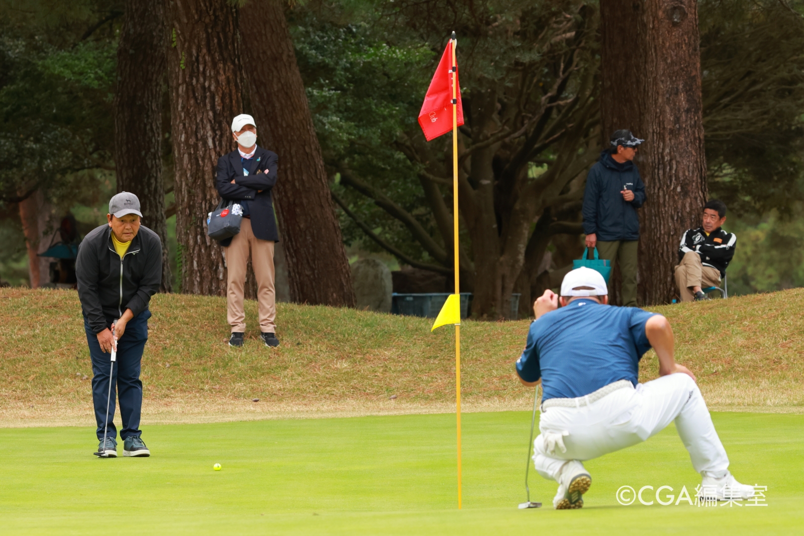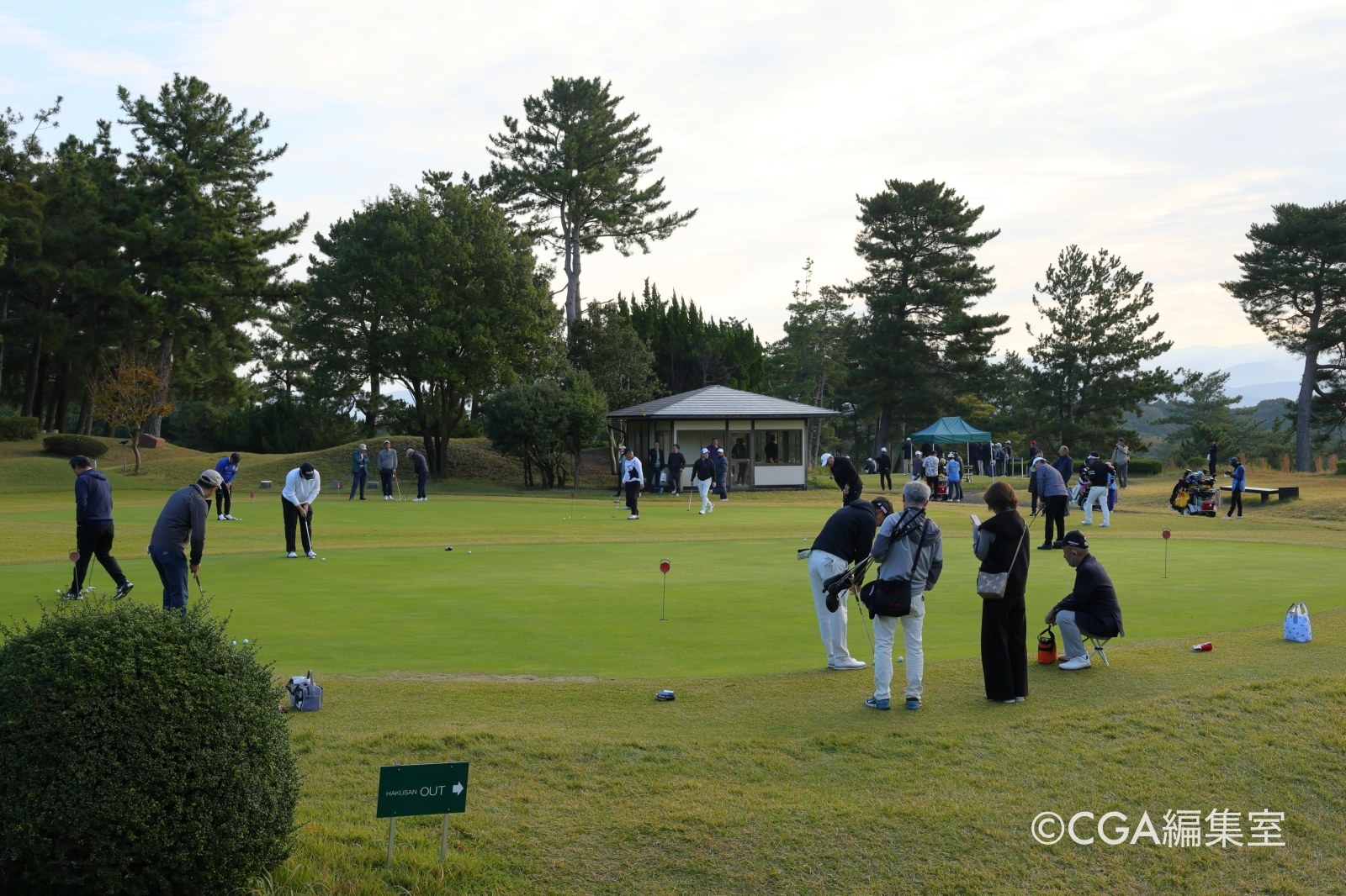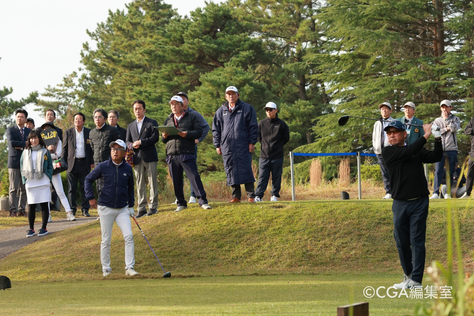 会場の片山津ゴルフ倶楽部は、朝のスタート時は10度を下回る寒さで、厚着をしていた選手たちも、陽が高くなるにつれて半袖姿の選手も多くなった。風もなく、青空が広がる絶好のゴルフ日和となった。ただ、スティンプ12.0、コンパクション23.5と発表されたグリーンコンディション。全ホール歩きのラウンドも選手たちを苦しめたのか、前半から聞こえてくるスコアは40超えが多かった。そんな中で、前半に優勝候補と囁かれたのが30台のスコアを4選手がマークした前年優勝の桑名CCと、2アンダー34ストロークをマークした福岡逸人選手を有する三好CC、そして40ストローク前後で安定していた会場の片山津GCだった。