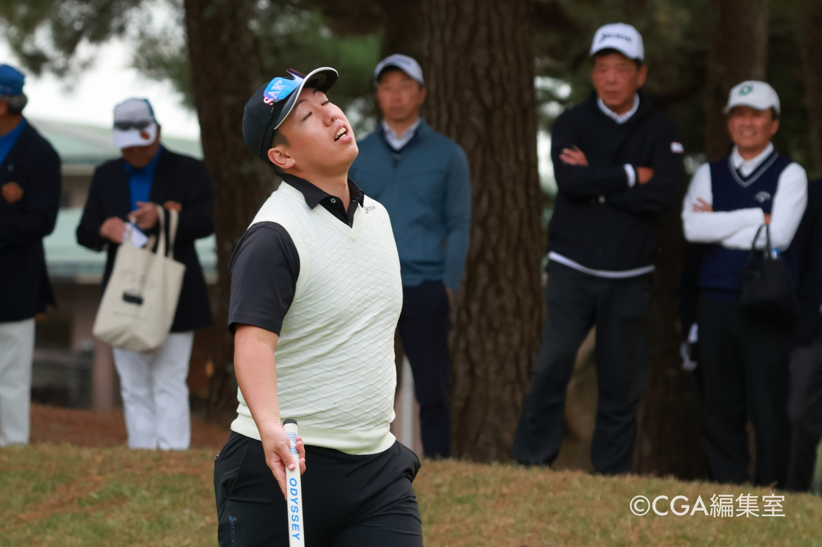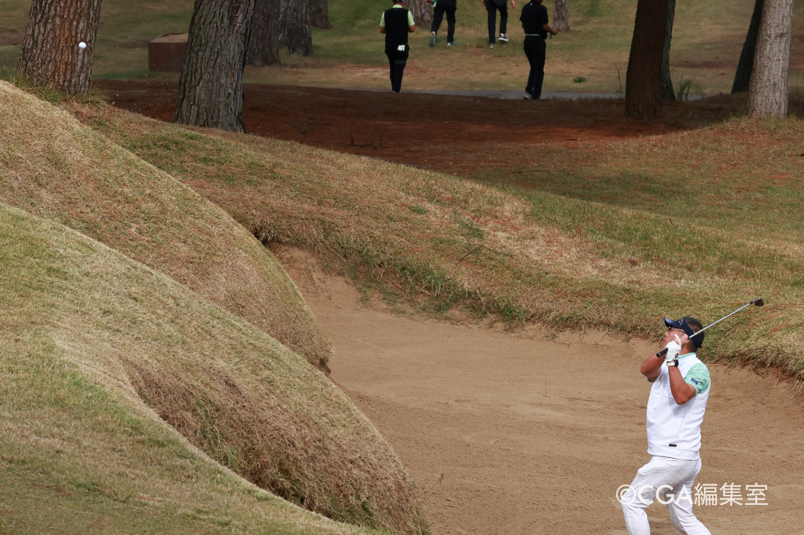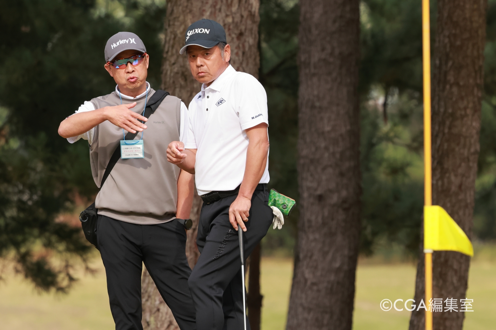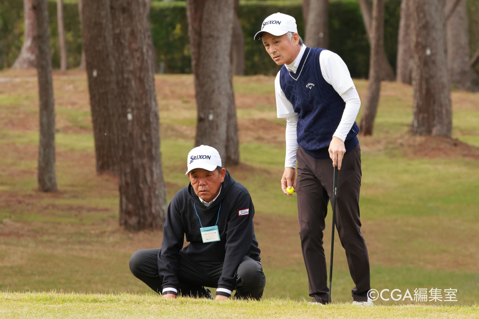 会場の片山津ゴルフ倶楽部は、朝のスタート時は10度を下回る寒さで、厚着をしていた選手たちも、陽が高くなるにつれて半袖姿の選手も多くなった。風もなく、青空が広がる絶好のゴルフ日和となった。ただ、スティンプ12.0、コンパクション23.5と発表されたグリーンコンディション。全ホール歩きのラウンドも選手たちを苦しめたのか、前半から聞こえてくるスコアは40超えが多かった。そんな中で、前半に優勝候補と囁かれたのが30台のスコアを4選手がマークした前年優勝の桑名CCと、2アンダー34ストロークをマークした福岡逸人選手を有する三好CC、そして40ストローク前後で安定していた会場の片山津GCだった。