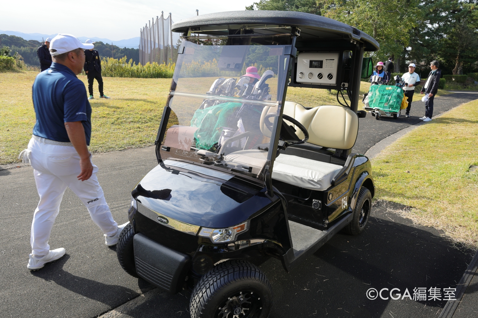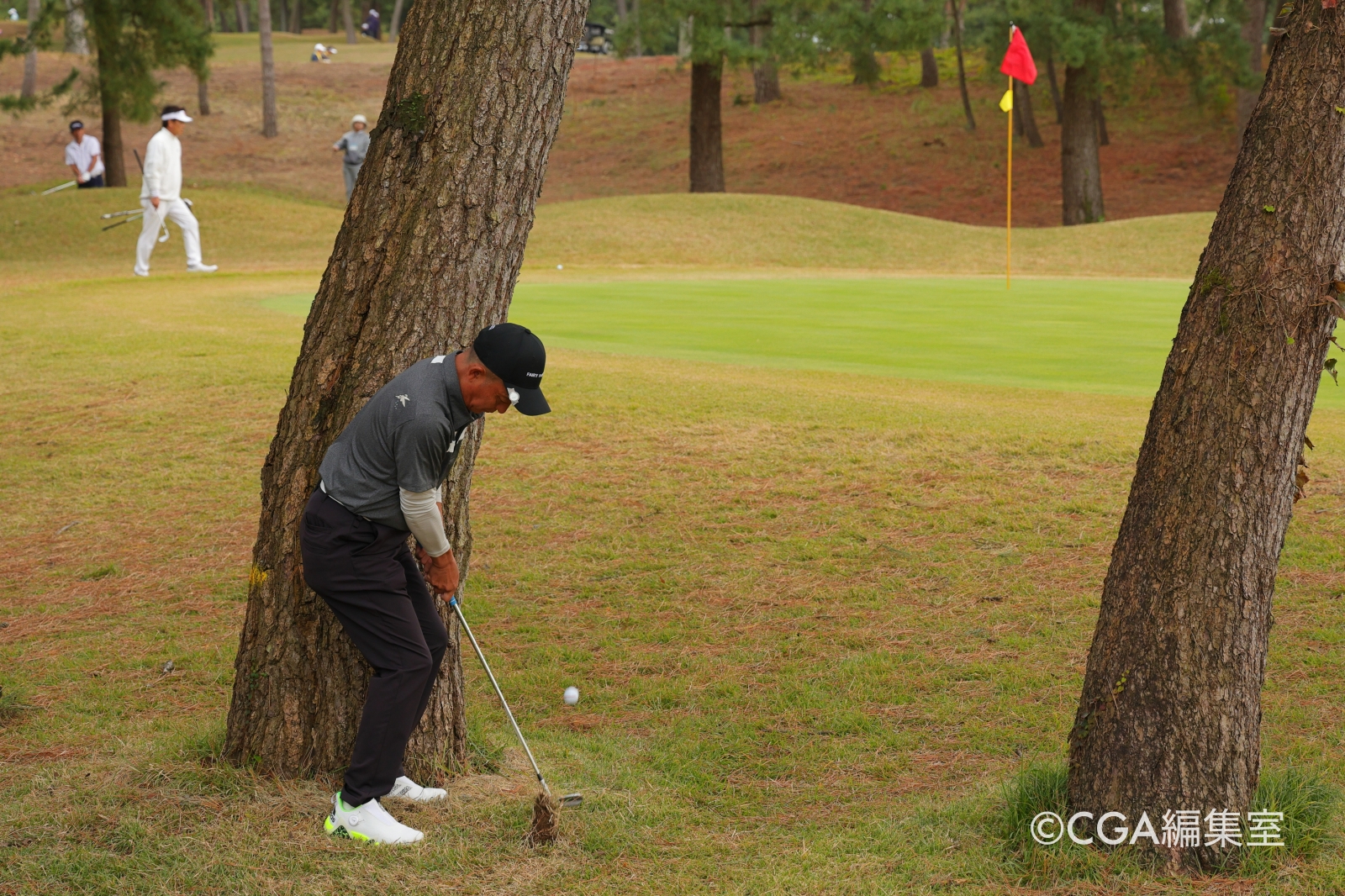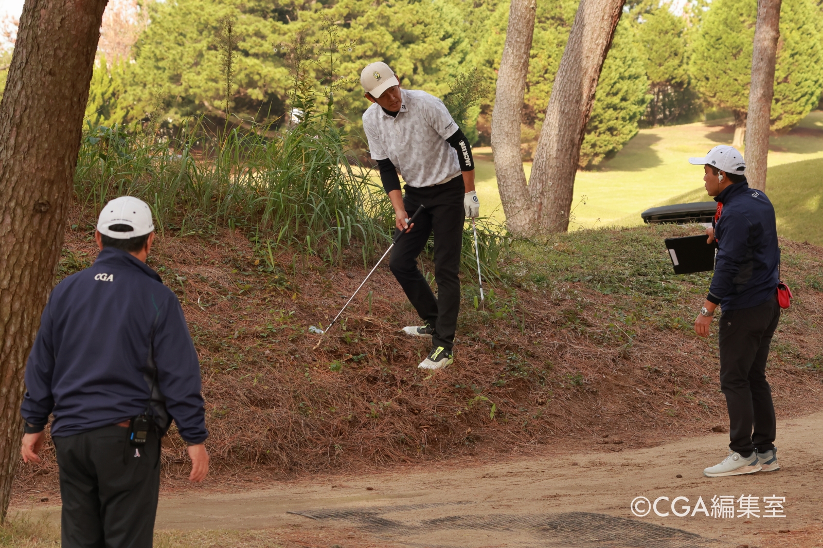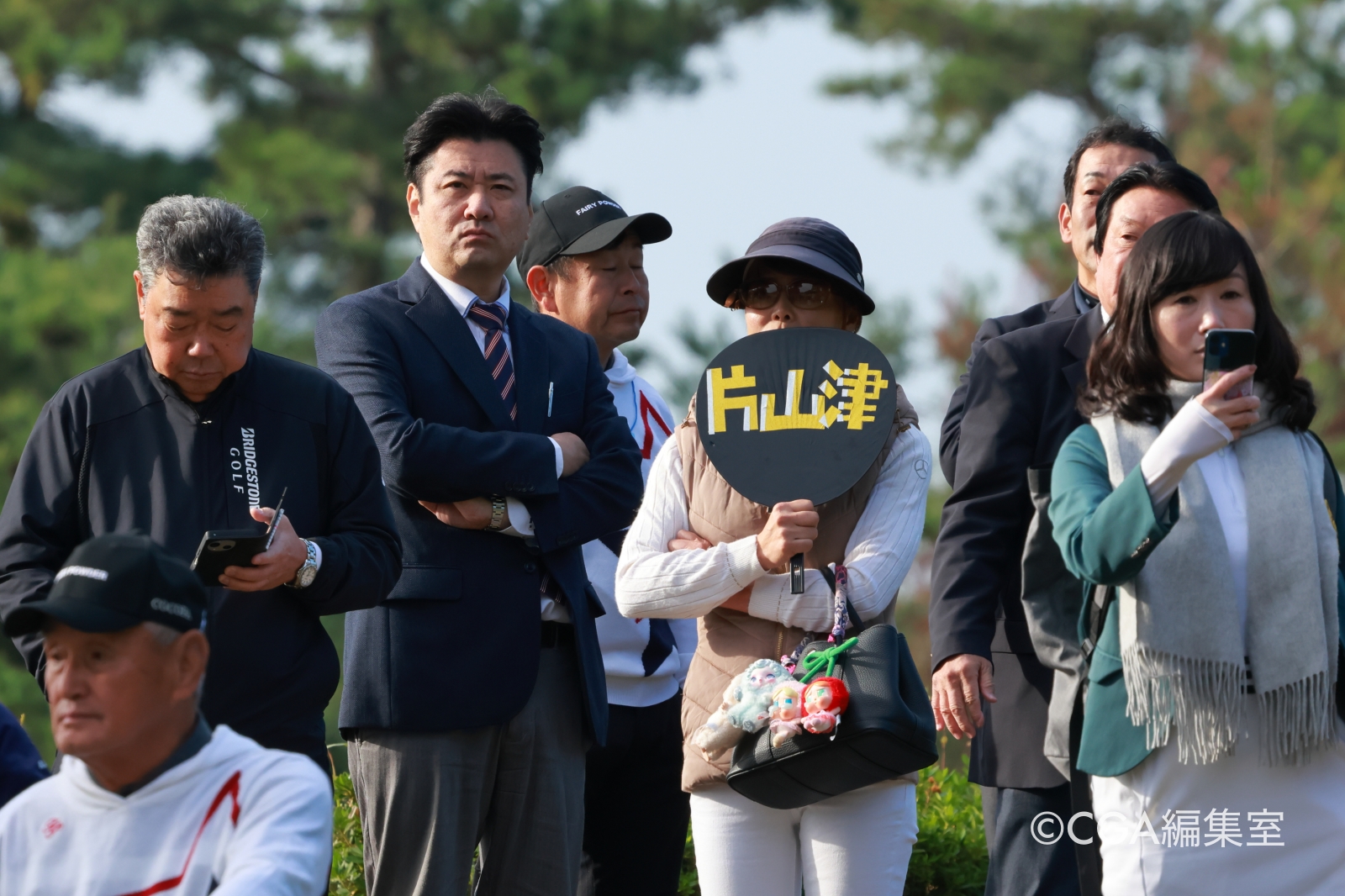 会場の片山津ゴルフ倶楽部は、朝のスタート時は10度を下回る寒さで、厚着をしていた選手たちも、陽が高くなるにつれて半袖姿の選手も多くなった。風もなく、青空が広がる絶好のゴルフ日和となった。ただ、スティンプ12.0、コンパクション23.5と発表されたグリーンコンディション。全ホール歩きのラウンドも選手たちを苦しめたのか、前半から聞こえてくるスコアは40超えが多かった。そんな中で、前半に優勝候補と囁かれたのが30台のスコアを4選手がマークした前年優勝の桑名CCと、2アンダー34ストロークをマークした福岡逸人選手を有する三好CC、そして40ストローク前後で安定していた会場の片山津GCだった。