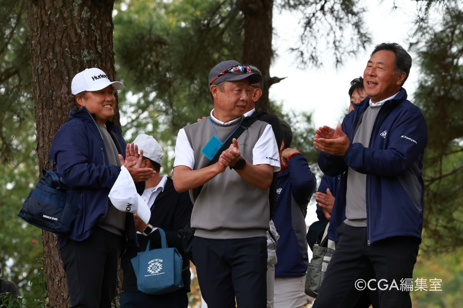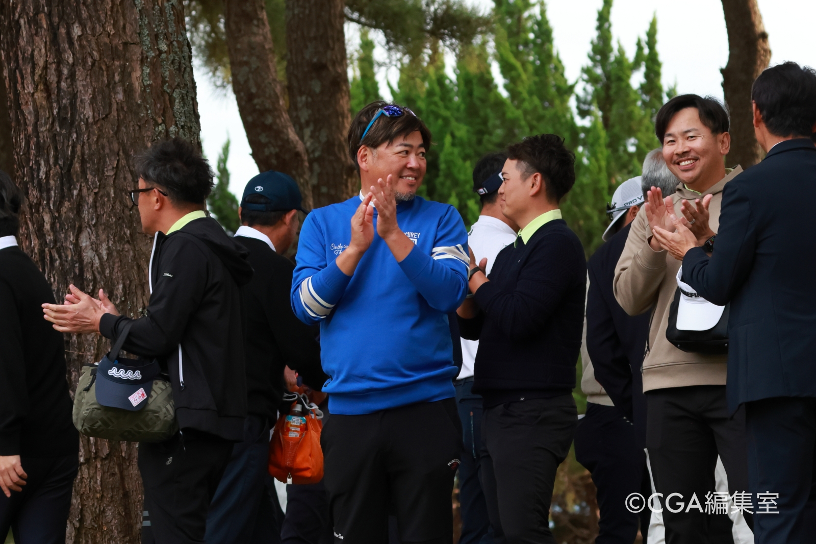 倶楽部関係者たちの情報が飛び交う中、いよいよ終盤。5人目のスコアが入った時点で、優勝争いはやはり桑名CC、三好CC、片山津GCに絞られてきた。一般の部最後の選手のスコア次第で、順位が変わる状況になった。最初に数字が確定したのは片山津GCで、太田憲治選手が81ストロークでホールアウトし、合計391ストロークとし暫定首位に。続いて、桑名CCの磯部真介選手が77ストロークという好スコアをマークすると、合計スコア389ストロークで首位に躍り出たのだ。残るは三好CC最後の増野逸実選手だけとなった。最終組で回る増野選手が9番Hパー5をパーで上がれば桑名CCと並ぶ、という局面。増野選手は、第3打をピン左5メートルにオンし、バーディパットはカップを1メートルほどオーバーしてしまう。しびれる場面だったが、落ち着いてパーパットを沈めた増野選手。ギャラリーからの「よっしゃー!!」の大歓声と拍手が鳴った。