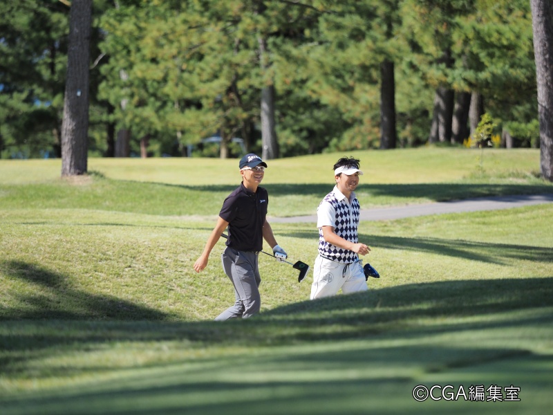 「アウトからスタートし、前半は3バーディ、3ボギーのイーブンパーで折り返したものの、後半は5ボギーを叩いた。「練ランに4回来たんですが、一度も80を切れなかったので、今日はよかった。一生懸命に作った自作メモが役に立ちました。打ってはいけないところがわかっていたので、下からを徹底しました」。(写真右が廣瀬選手)