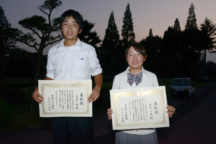 大会表彰に合わせて、今年の日本アマチュアゴルフ選手権で優勝した小木曽喬選手(福井工大福井高3年)と、全米女子オープンでクオリファイまで闘った橋本千里選手(ルネサンス豊田高1年)に中部ゴルフ連盟から特別表彰状が贈られました。