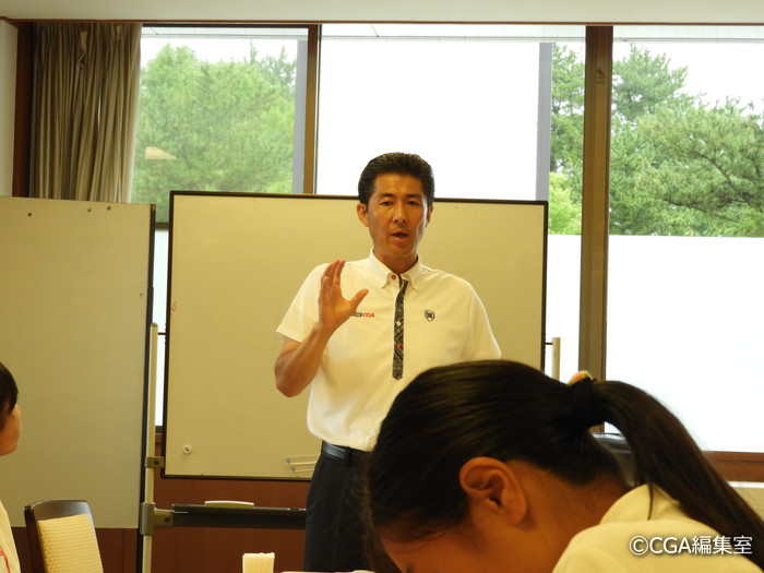 前日に続いて行われたラウンド合宿。今回は三好カントリー倶楽部が会場となった。集合後、堀田勝市CGAジュニア育成委員会発掘育成部会長から「メンバーズコースでトレーニングをさせていただくことへの感謝をすること。メンバーの方々に挨拶をしっかりすること。大切な場所と時間なので、精いっぱい集中して練習を行うこと。また、来週の日本ジュニアに向けて有意義な練習となるように」など話があった。